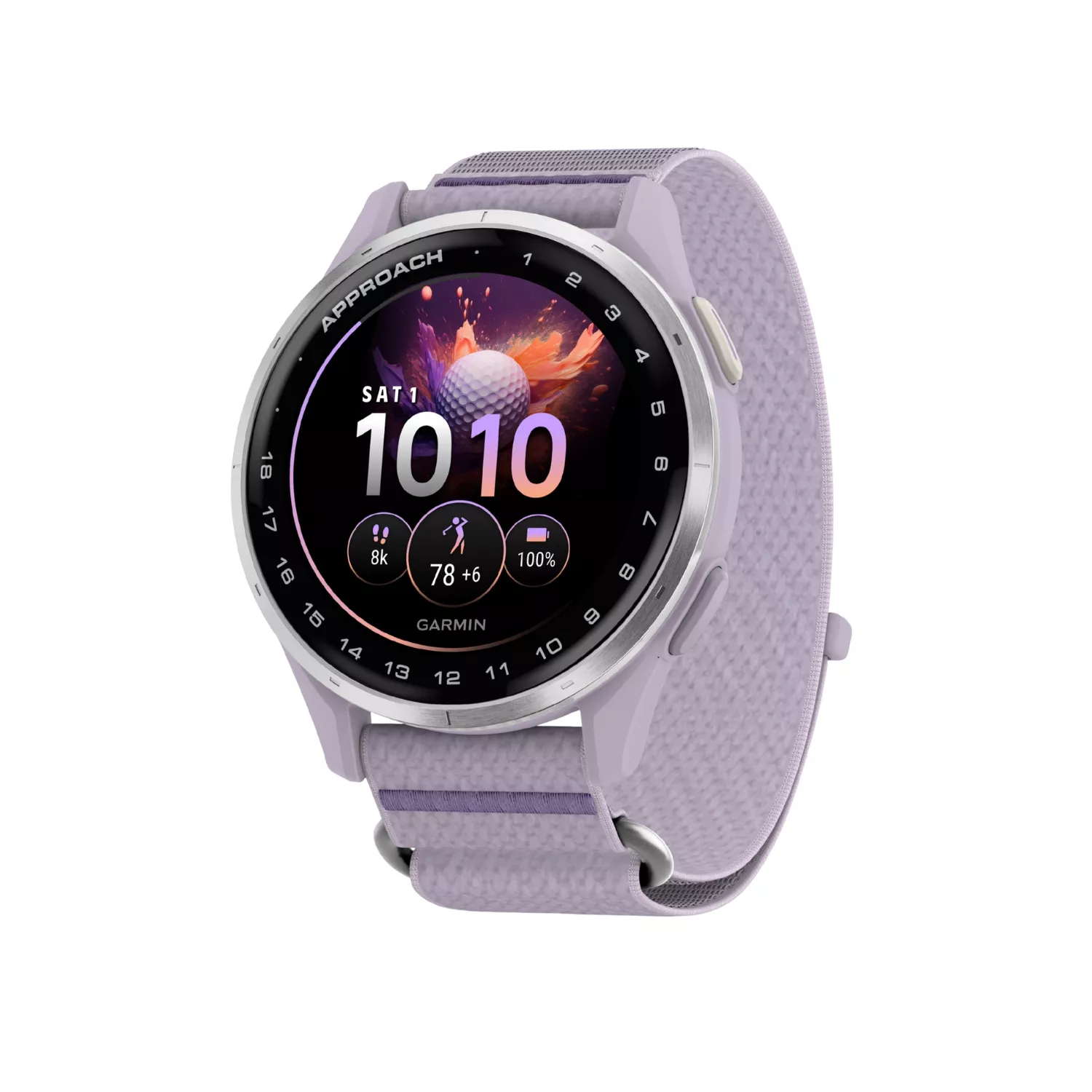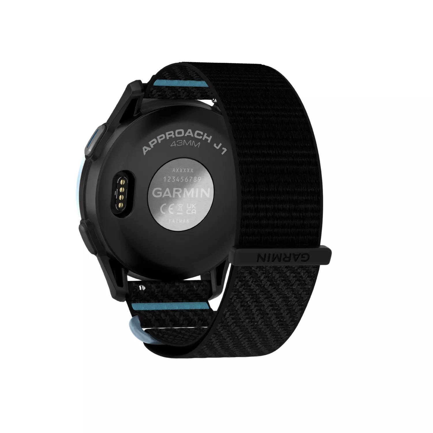 The Garmin Approach J1 is a lightweight and modern golf focused smartwatch designed to blend everyday comfort with on course performance. Featuring two color options - a Cloud Blue anodized aluminum bezel with a Black and Azure ComfortFit fabric band with a hook and loop closure and Silver Aluminum Bezel with Lilac ComfortFit Fabric Band with a hook and loop closure, these watches are built for all day wear. Its compact 43 x 43 x 11.4 mm case fits wrists from 115 to 195 mm and weighs only 29 grams, making it barely noticeable during play or daily activities. A chemically strengthened glass lens and an AMOLED display with optional always on mode provide durability and excellent visibility in various lighting conditions.