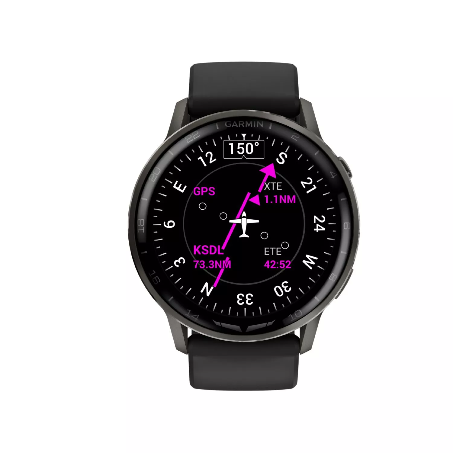 Aviation features are integrated seamlessly into the D2 Air X15 experience. The watch includes worldwide airport and navigation databases, aviation alerts, METAR and TAF weather reports, and the ability to wirelessly receive flight plans from Garmin Pilot when paired with a compatible device. A built in barometric altimeter, three axis compass with horizontal situation indicator, and in flight Pulse Ox monitoring help pilots stay informed and situationally aware.