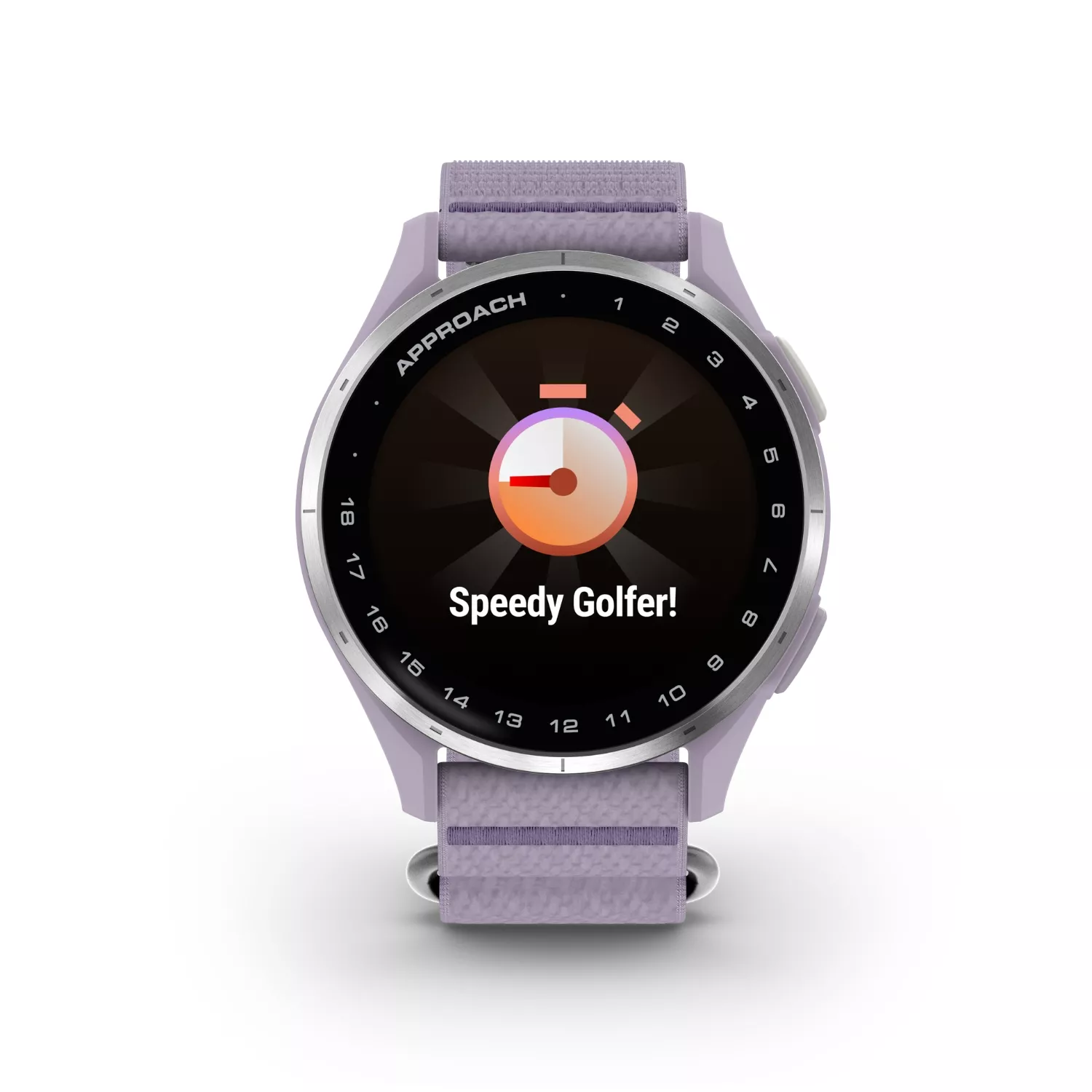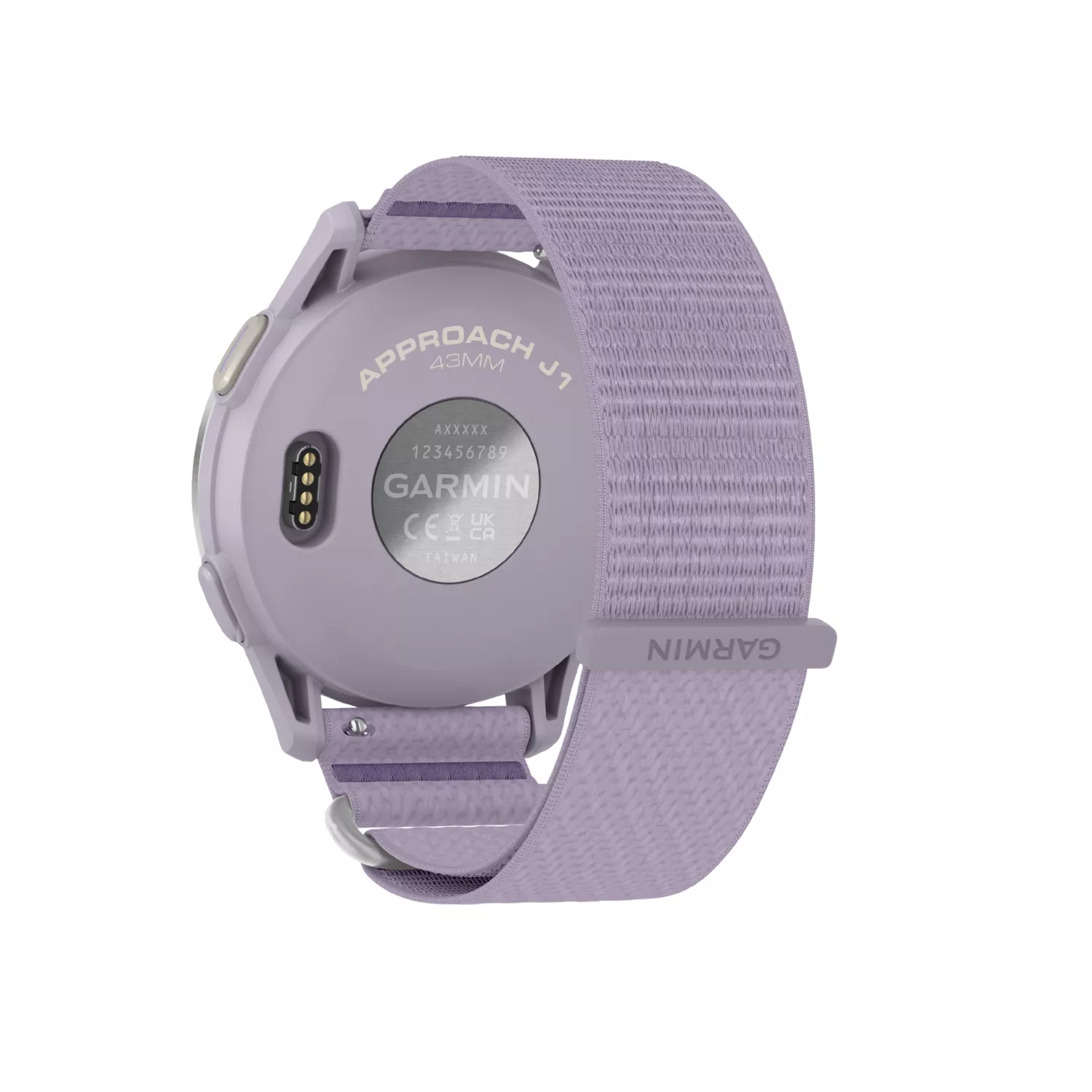 The Garmin Approach J1 is a lightweight and modern golf focused smartwatch designed to blend everyday comfort with on course performance. Featuring two color options - a Cloud Blue anodized aluminum bezel with a Black and Azure ComfortFit fabric band with a hook and loop closure and Silver Aluminum Bezel with Lilac ComfortFit Fabric Band with a hook and loop closure, these watches are built for all day wear. Its compact 43 x 43 x 11.4 mm case fits wrists from 115 to 195 mm and weighs only 29 grams, making it barely noticeable during play or daily activities. A chemically strengthened glass lens and an AMOLED display with optional always on mode provide durability and excellent visibility in various lighting conditions.